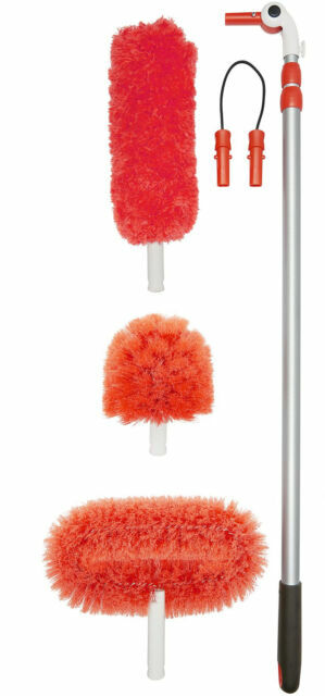 Oxo long reach dusting system has a sturdy steel twist and lock pole with a soft comfortable non slip grip which extends to 8 ft with a simple twist and collapses to 3 ft for storage.